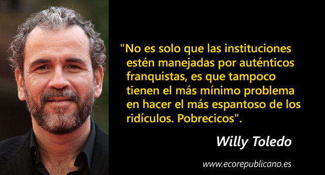 En facebook, Willy Toledo ha escrito: "No es solo que las instituciones estén manejadas por auténticos franquistas, es que tampoco tienen el más mínimo problema en hacer el más espantoso de los ridículos. Pobrecicos".